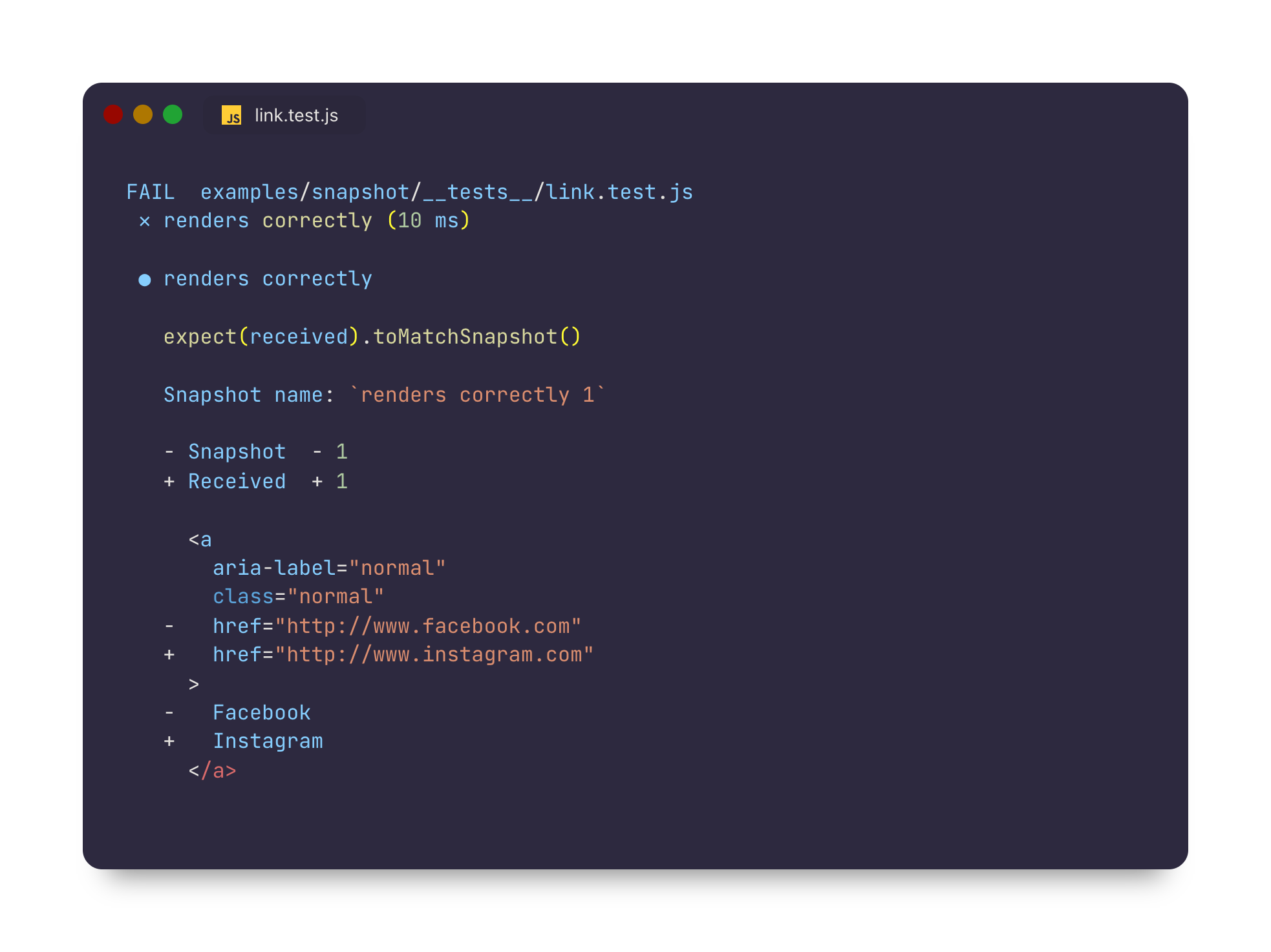 The snapshot artifact should be committed alongside code changes, and reviewed as part of your code review process. Jest uses pretty-format to make snapshots human-readable during code review. On subsequent test runs, Jest will compare the rendered output with the previous snapshot. If they match, the test will pass. If they don't match, either the test runner found a bug in your code (in the <Link>